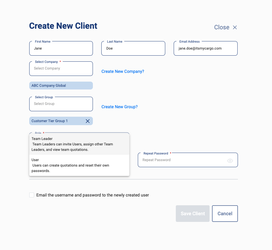 4. After filling out the Name and Email Address information for the new client, to assign a client to a company or group, search and select. Click Save, and you can find your Client now under Client Overview.