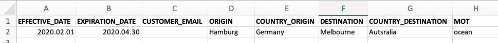 A second troubleshooting mistake that can happen accidentally is the application of false formats within the spreadsheets. This can commonly happen in the effective and expiration date section. Usual formats used for dates are YYYY-MM-DD or DD-MM-YYYY. Formats such as Mar 13, 2020, will not be accepted and acknowledged as incorrectly during the data upload process. You must ensure that your cell contents match what is required. Please see our Excel template guides for these restrictions. A further example could be the ‘Load type’: make sure to specify your load type correctly, such as ‘lcl’ or ‘fcl_20’, ‘fcl_40’, ‘fcl_40_hq’.